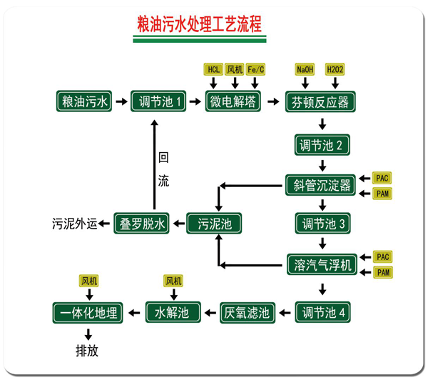 污水集中收集進(jìn)入調(diào)節(jié)池1,在調(diào)節(jié)池1進(jìn)行水質(zhì)水量的調(diào)節(jié),經(jīng)泵入鐵碳微電解芬頓組合,過(guò)氧化氫(H2O2) 與二價(jià)鐵離子Fe的混合溶液將很多已知的有機(jī)化合物如羧酸、醇、酯類(lèi)氧化為無(wú)機(jī)態(tài),具有較強(qiáng)的氧化性,氧化掉污水中的大部分有機(jī)物。出水進(jìn)入調(diào)節(jié)池2,在調(diào)節(jié)池2進(jìn)行水量均衡,經(jīng)泵進(jìn)入斜管沉淀器,加入PAM、PAC進(jìn)行絮凝沉淀,污泥排入污泥池,出水進(jìn)入調(diào)節(jié)池3進(jìn)行水質(zhì)水量的調(diào)節(jié),經(jīng)泵入溶汽氣浮機(jī),氣浮機(jī)產(chǎn)生的小氣泡配合PAC、PAM共同作用將污水中的大部分有機(jī)物以懸浮物的形式去除,浮渣和底部污泥排入污泥池。出水進(jìn)入調(diào)節(jié)池4,在調(diào)節(jié)池4進(jìn)行水質(zhì)水量泵入?yún)捬鯙V池將污水中大的分子鏈打斷減輕后續(xù)好氧的負(fù)荷,出水通過(guò)水解池內(nèi)設(shè)置的泵進(jìn)入一體化地埋設(shè)備,經(jīng)過(guò)地埋的生化處理后降解吸附污水中的有機(jī)物出水排放。污泥池中的污泥通過(guò)疊羅脫水機(jī)脫水后污泥外運(yùn)處理,上清液回流到調(diào)節(jié)池1進(jìn)行循環(huán)處理。